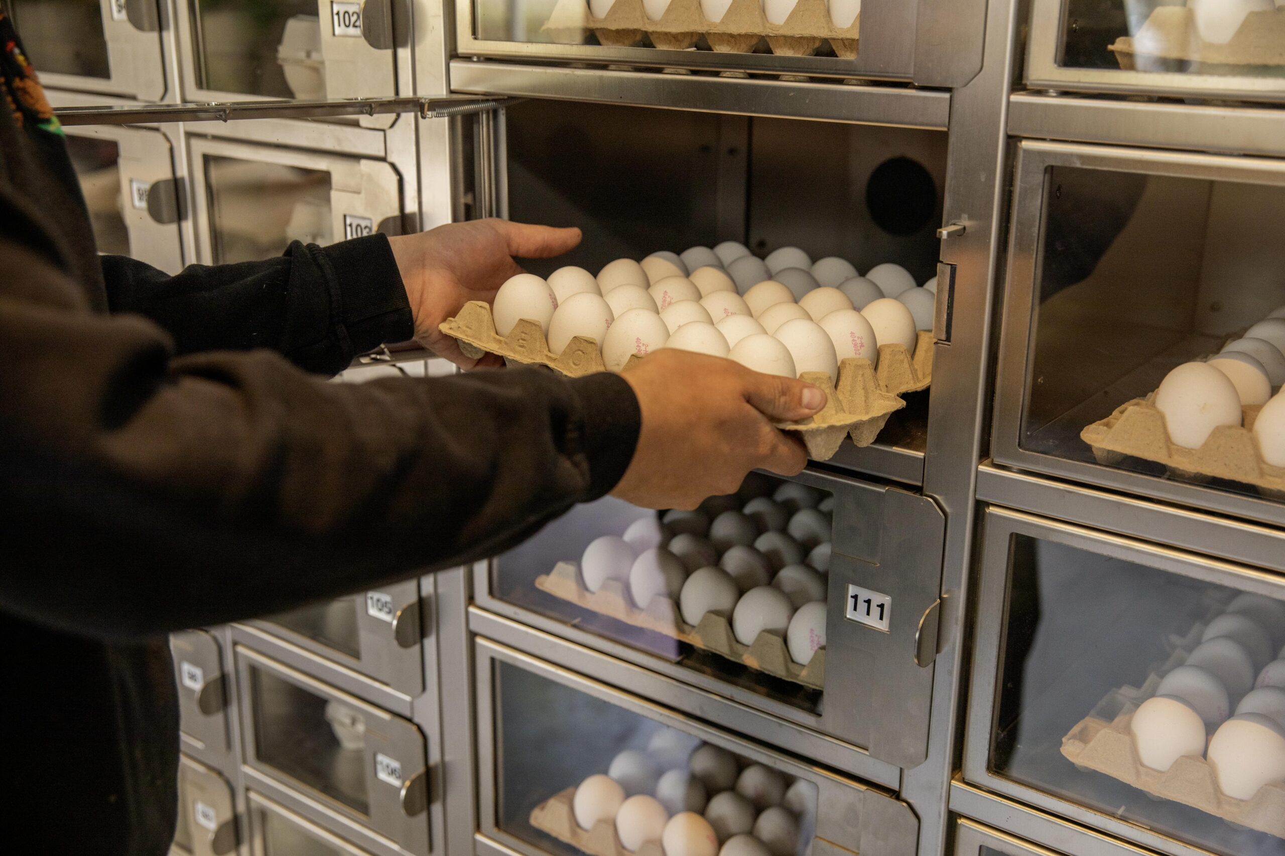 “Voorheen met een simpele kast, maar sinds juni dit jaar hebben we een automaat. Niet alleen onze eieren, maar ook onze aardappelen en uien verkopen we hier.” De eieren die niet regionaal verkocht worden, gaan via Van Beek naar de retail.